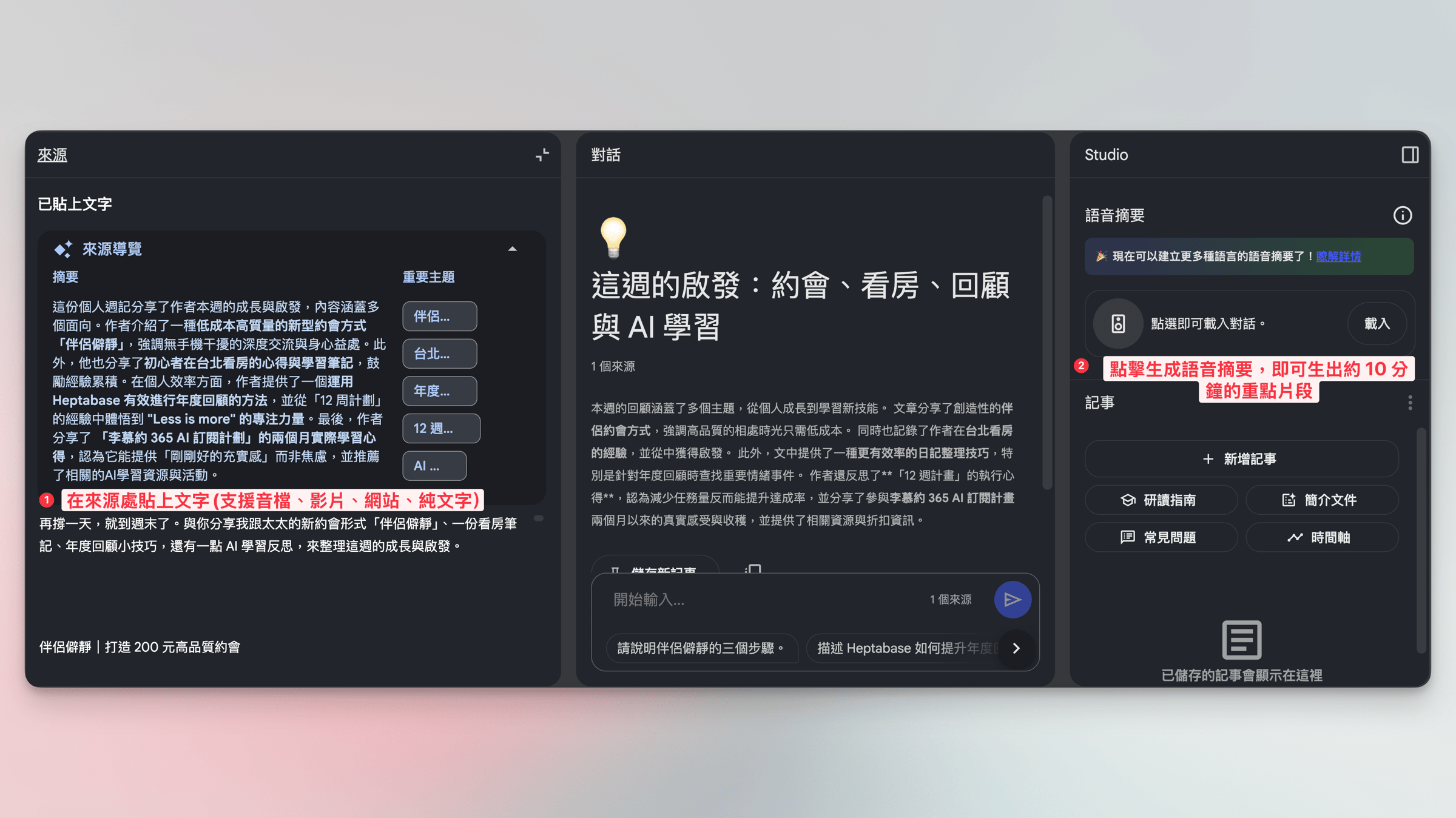 - 在 「Studio」處生成 「語音摘要」,轉成兩人電台 Podcast